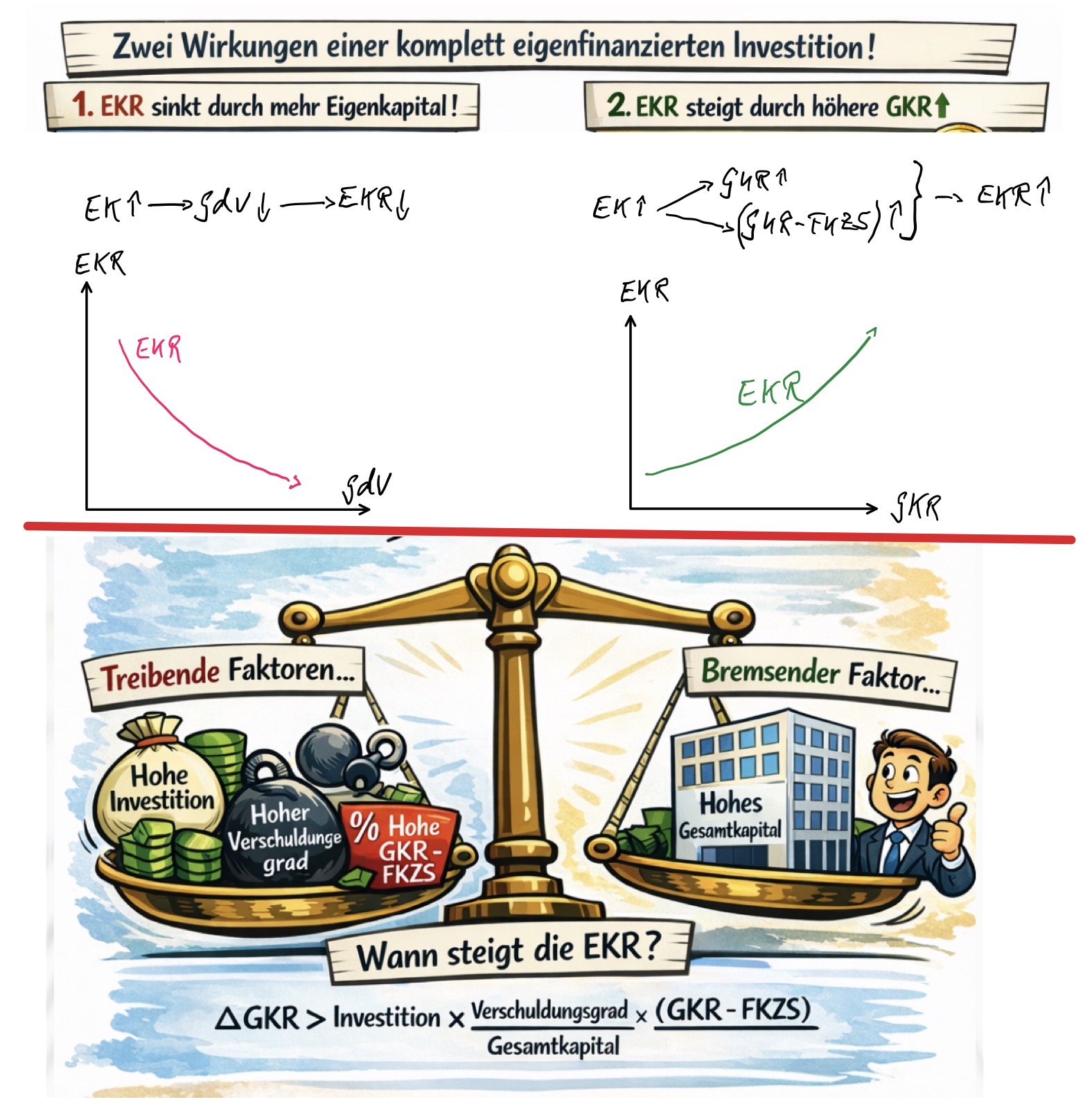 1 Leverage-Effekt Es gilt: $ \small EKR = GKR + (GKR – FKZS) \cdot \frac{FK}{EK} $ Bzw.: $ \small EKR…