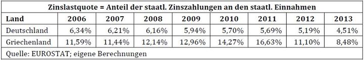 Zweifelsohne hat Griechenland ein Schuldenproblem. Die Schuldenquote als Verhältnis von Staatsschulden zum Bruttoinlandsprodukt beträgt in Griechenland mehr als 170%. Doch ist die Schuldenquote alleine nicht maßgeblich, zumal ihr Anstieg in Griechenland in erheblichem Ausmaß auf den Einbruch des Bruttoinlandsprodukts zurückzuführen ist. Die Analyse müsste daher auch die Zinslastquote als Quotient von Zinsausgaben zu Staatseinnahmen ins Visier nehmen.